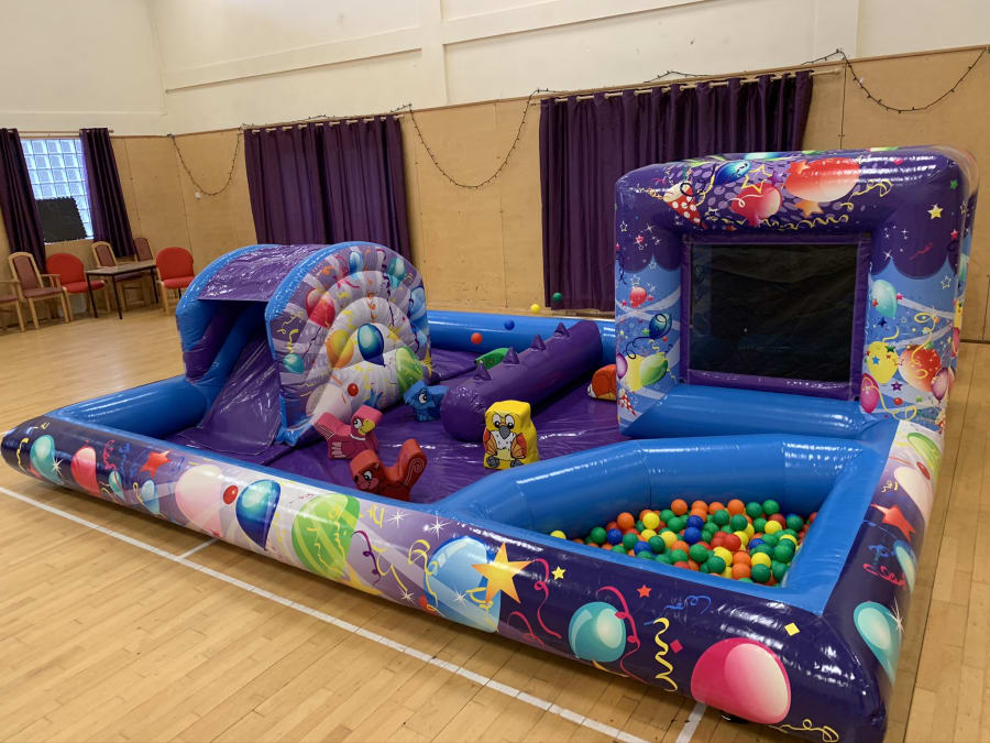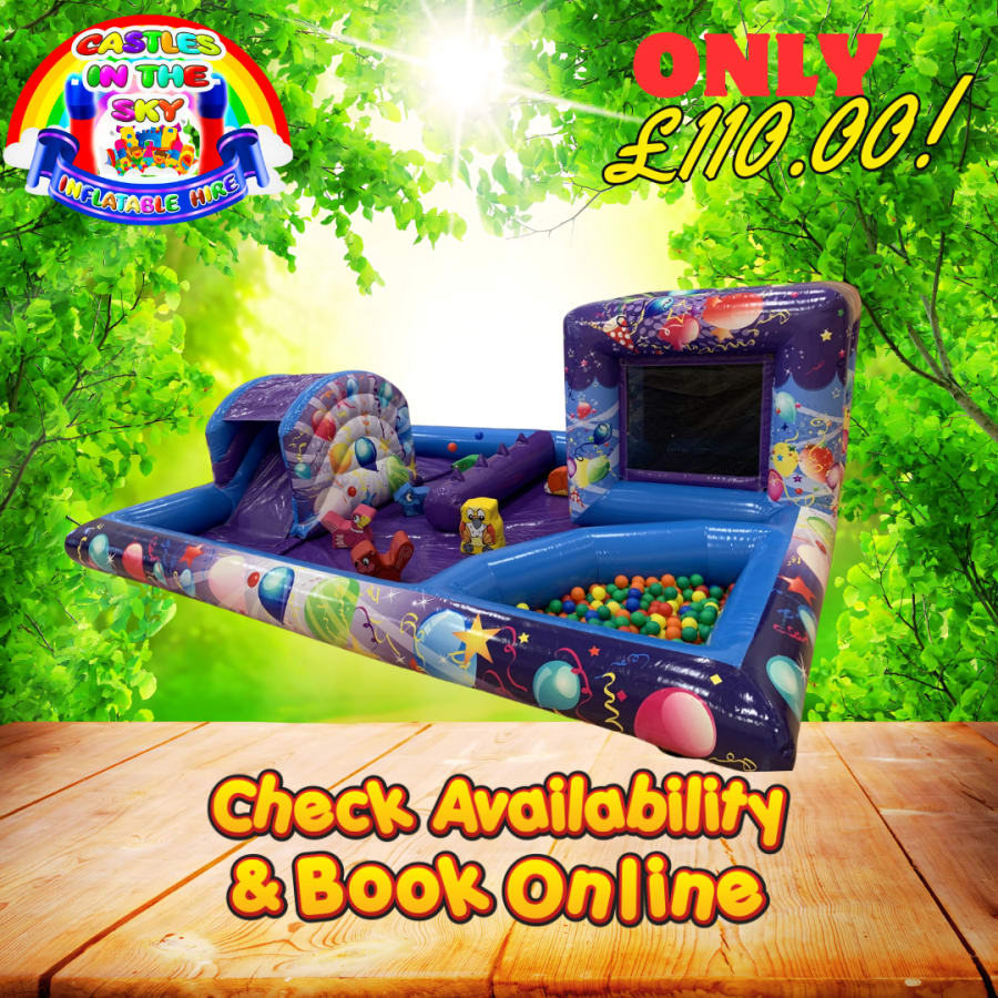 Our Multi Activity Toddler Play Zone is designed to bring an array of fun elements in an all in one fun inflatable. Using There touch, and other senses children can explore this superb play zone which includes an enclosed netted bouncy castle so you can see the children playing safely, a small slide with easy to climb steps, a ball pit with colourful balls to light up the senses and the amazing air jugglers that make the balls float in the air. Also to complete this amazing set up your also get some soft play shapes for the children to play with.